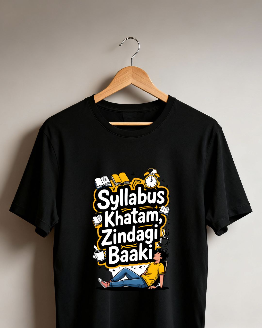 Celebrate the end of syllabus and the beginning of real life with "Syllabus Khatam Zindagi Baaki"—a witty Hindi reminder that exams are just the start.